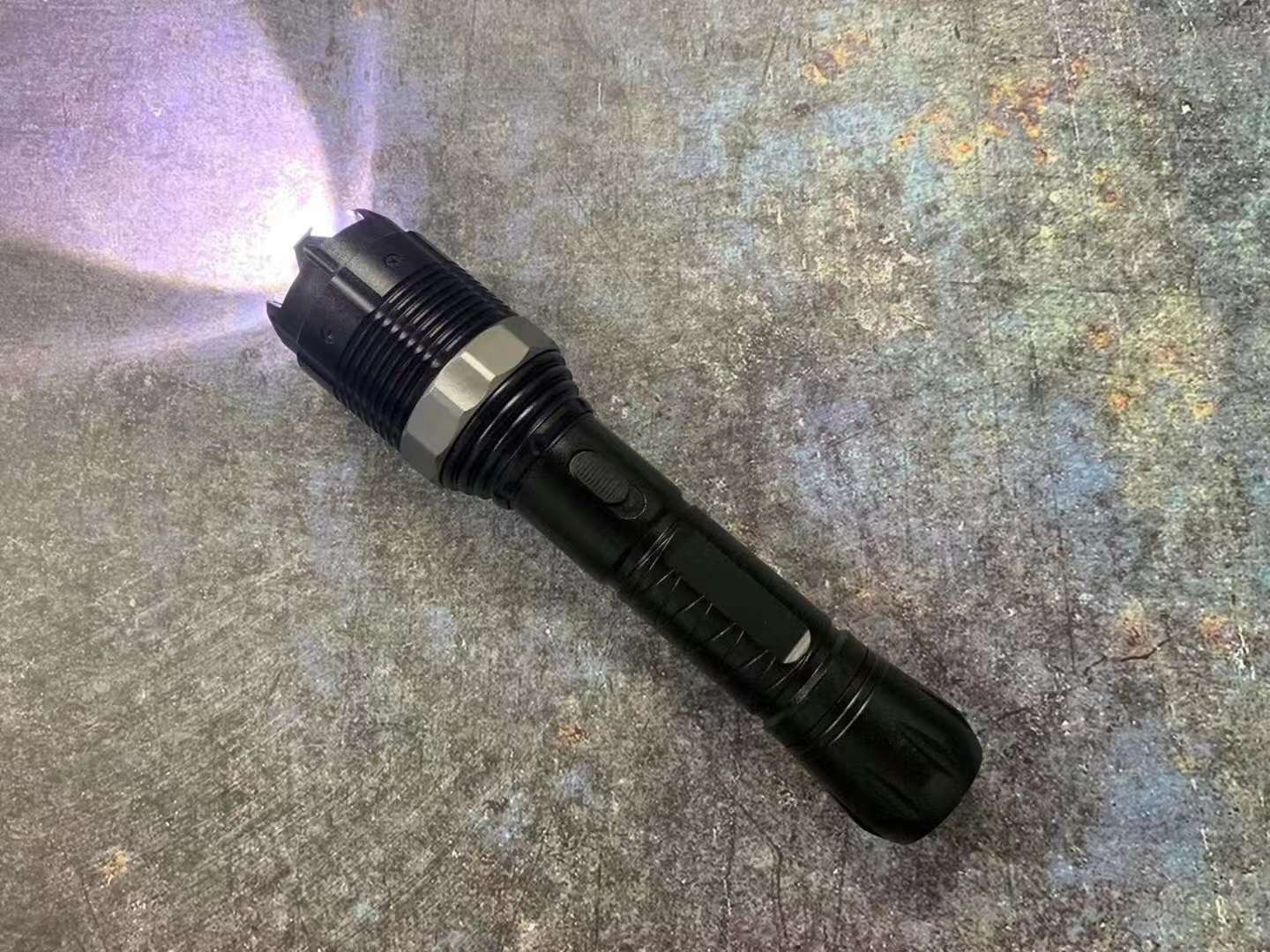 1、尾部总开关打开,中间长方形开关往前推,是照明档位,反复几次可以强光、弱光、爆闪,旋转调焦环可以聚光。